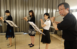 左のような記念コンサートや式典以外にも、6月6日(月)〜9日(木)の4日間、全国の指導者が松本に集結して、よりよき指導のための研究を行ないました。写真は、新しくフルート科教授に就任された宮前丈明教授とともに、さまざまな課題の研究を重ねたフルート科の様子です。