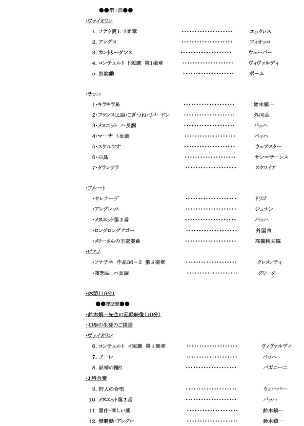 また、1980年前後の指導者研究会で鈴木先生が壇上でレッスンをされる映像や、夏期学校で生徒にグループレッスンをされる様子を記録した映像もご覧いただきます。13時開演。入場料は無料です。