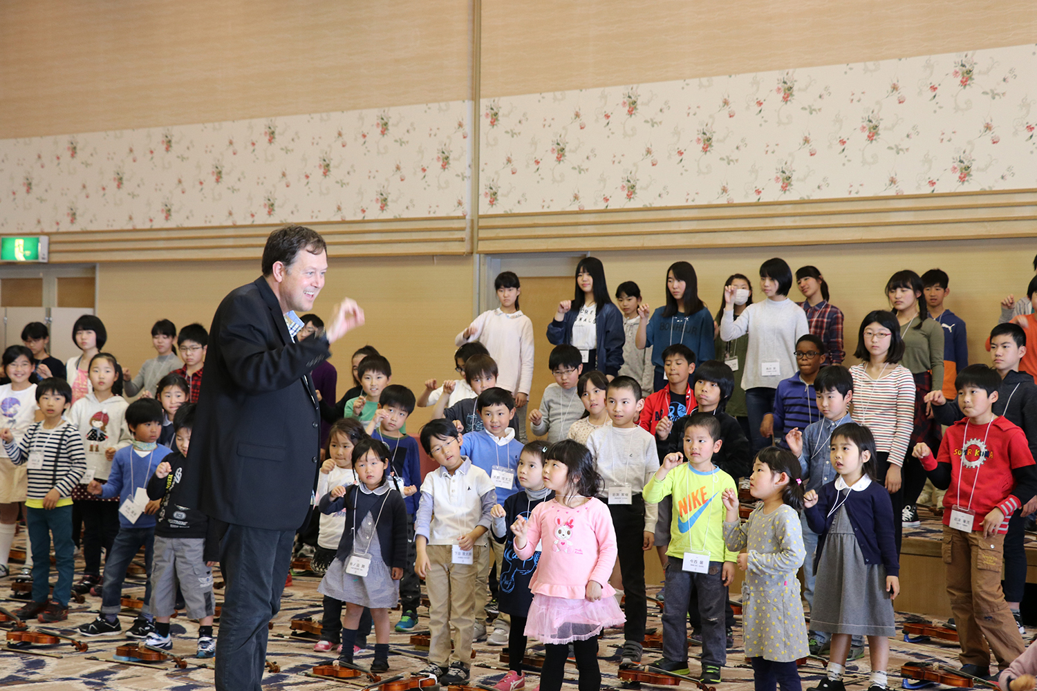 どの子も、ブライアン先生の表情、そして動きに目が離せません。それほど魅力的なのです。聴衆の皆さんに合いの手の拍手を入れてもらうなど、アイデアもたっぷり。フォルテは、体全体でフォルテに、ピアノは本当にピアノにという強弱のつけ方で、音が生き生きとしてきました。「会場の奥まで届くような音で弾いてみよう」を大きな体でリードされると、子どもたちの音もそれなりに鳴ってきます。モーツァルトの協奏曲第5番の出だしの3つの音の表現の考え方として、「トマトの種を植えて、葉が育ち、そして花が咲く感じ」という独特な表現をされていました。すると、音の広がりが豊かになり、一つひとつの音にエネルギーが感じられ、効果満点。子どもたちも敏感に感じ取っていました。