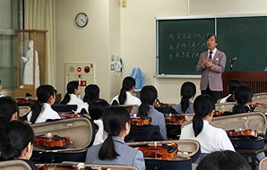 4月26日(水)、スズキ・メソードのヴァイオリン教育を授業に取り入れている福岡市の博多高等学校で、早野龍五会長による公演が行なわれました。昨年1年間、スズキの指導者の下で、ヴァイオリンを受講してこられた2年生の生徒さんは、会長と「キラキラ星変奏曲」の共演も実現しました!