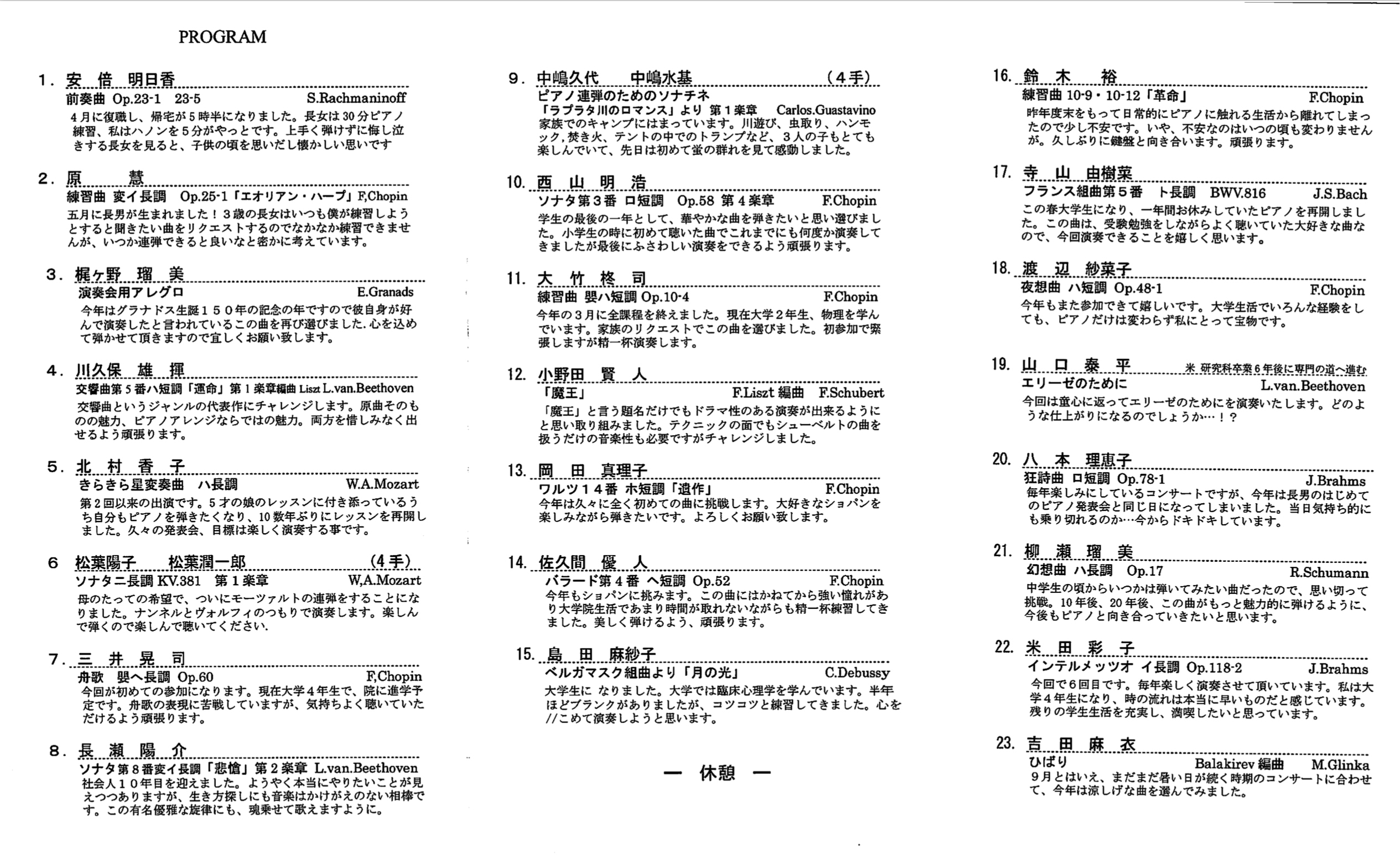 今年参加して思ったことは、一日中何も考えずに音楽のシャワーを浴びながら思い耽る時間をつくる、ということは自分にとってとても大切なことだな、ということです。仕事や子育てで日々追われる生活を送っていると、どうしても周りや自分自身の大切なことについて見えにくくなってしまうことがあると思いますが、今回コンサートに参加できたことで普段とは違った脳が刺激されてリフレッシュできましたし、明日への活力にもなりました。音楽は瞑想のような効果があるのかもしれませんね。ですから、このような貴重な機会に毎年参加できていることが本当に嬉しいですし、人間としての成長を温かく、そして根気よく見守り続けてくださっている先生方には感謝してもしきれません。
