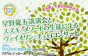 三重支部が、鈴木鎮一生誕120周年を祝い、早野龍五会長の講演会とスズキ・メソードの生徒たちによるヴァイオリンとチェロのコンサートを9月2日(日)、NTNシティホール小ホール(旧桑名市民会館)で開催します。奮ってご参加ください。