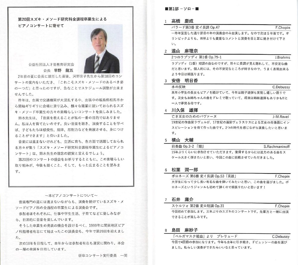 今回からは、参加者有志も運営に関わるようになり、次の10年を目指して、さまざまなアイデアが盛り込まれるようになりました。どの参加者も、忙しい時間を縫っての練習は、さぞかし大変だったはずですが、見事な演奏が続く姿は、一生音楽とともにある豊かな人生を目指すスズキ・メソードの理想形とも言えます。今後、ますますこの催しが広く知られるようになることを期待しています。