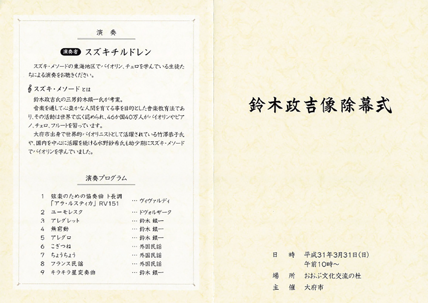まずは、岡村秀人大府市長より、主催者として「予定以上の寄付を賜り、大変感謝しています。今後は鈴木政吉さんなど郷土の偉人を道徳の副教材でも扱うことになりますし、今回の銅像の制作をきっかけに、大府が音楽の町、ヴァイオリンの町であることを多くの皆さんに知って欲しいです」とのご挨拶がありました。