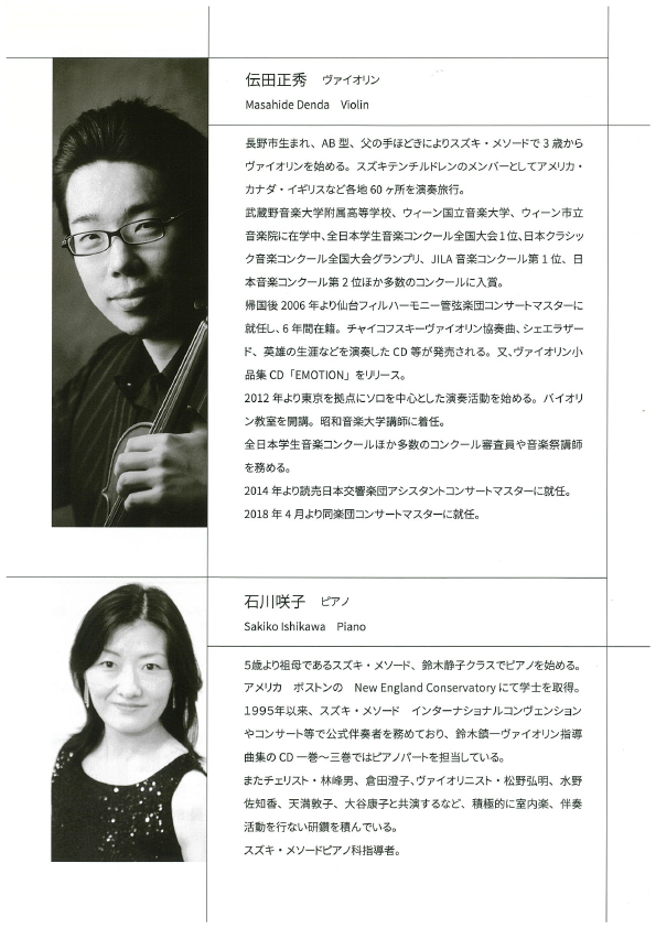 今回は、12月1日(日)14時開演で、このところスズキ・メソードに関係するイベントでおなじみの読売日本交響楽団コンサートマスターの伝田正秀先生のヴァイオリンリサイタルになります。共演のピアニストは、関東地区ピアノ科指導者の石川咲子先生。9月29日(日)の総合舞台劇「音にいのちあり〜鈴木鎮一 愛と教育の生涯」では、お二人の息をピッタリ合わせた生演奏が評判になりました。