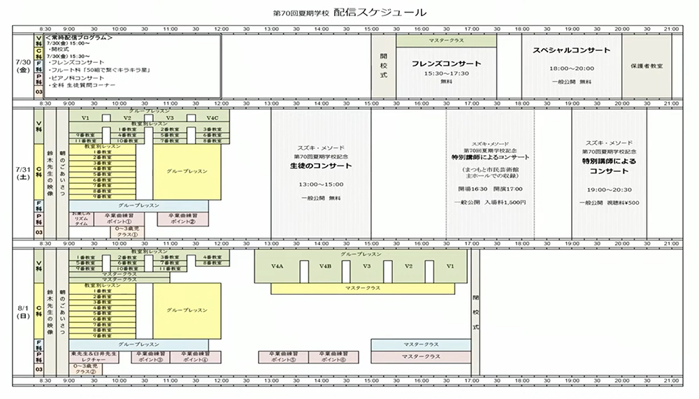 ※ヴァイオリン科とチェロ科の教室別レッスンは、生徒登録をしてその教室を選択した生徒のみZoomで参加し、それ以外の夏期学校参加者はVimeoで配信される映像を視聴することになります。