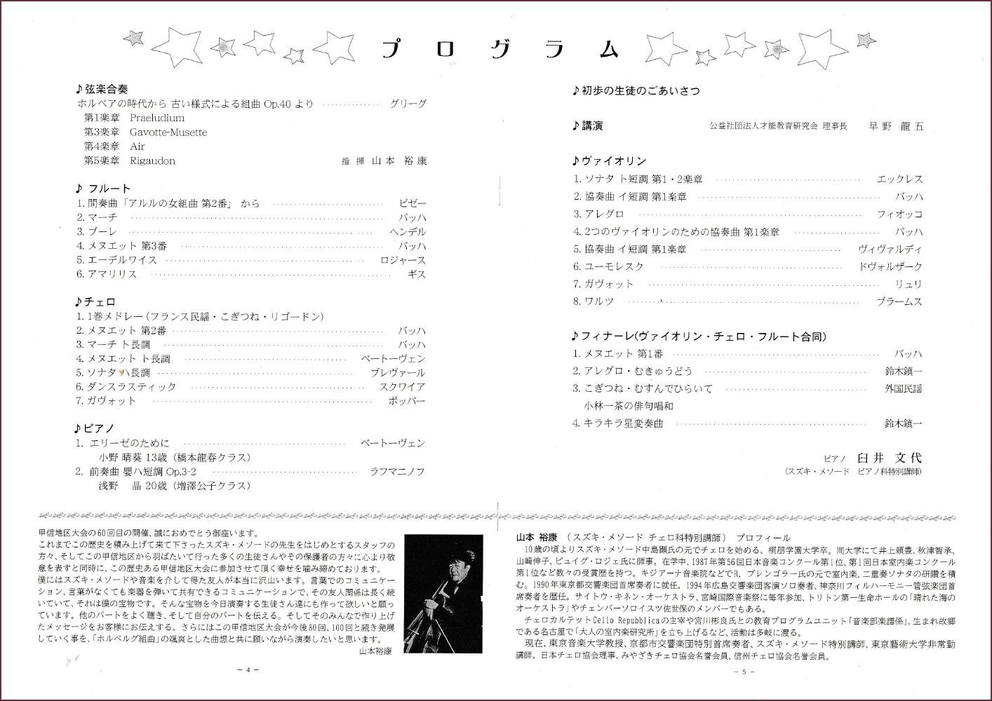 60回目を岡谷で開催することが決まった段階から、何か核になる企画はないかと思案しました。そこで思いついたのが、本会チェロ科特別講師の山本裕康先生に弦楽の指揮・指導をしていただくことでした。主管する岡谷諏訪支部の指導者間で了承を得て2023年の夏期学校の際に山本先生に腹案をお話しました。ただ、その時点では会場の確保ができる時期ではなかったため、ホールの予約が完了した時点で再び依頼することとなりました。13ヵ月前にあたる2023年9月にカノラホールの予約が完了し、真っ先に山本先生のご都合をお伺いしましたところ、大学の行事が重なっていたのですが、ご都合を付けていただけることになり、コンサートの核となる部分が決まりました。その他は各科の演奏、初歩のごあいさつ、早野会長(現理事長)の講演と決め、具体的に動き始めました。