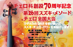 2025年4月6日(日)に文京シビックホール大ホールで開催される「第26回スズキ・メソード チェロ全国大会」。今年の文化勲章を受章される、ゲストの堤剛先生の演奏曲が決まりましたので、チラシもリニューアル。広告・協賛などについてもお知らせします。