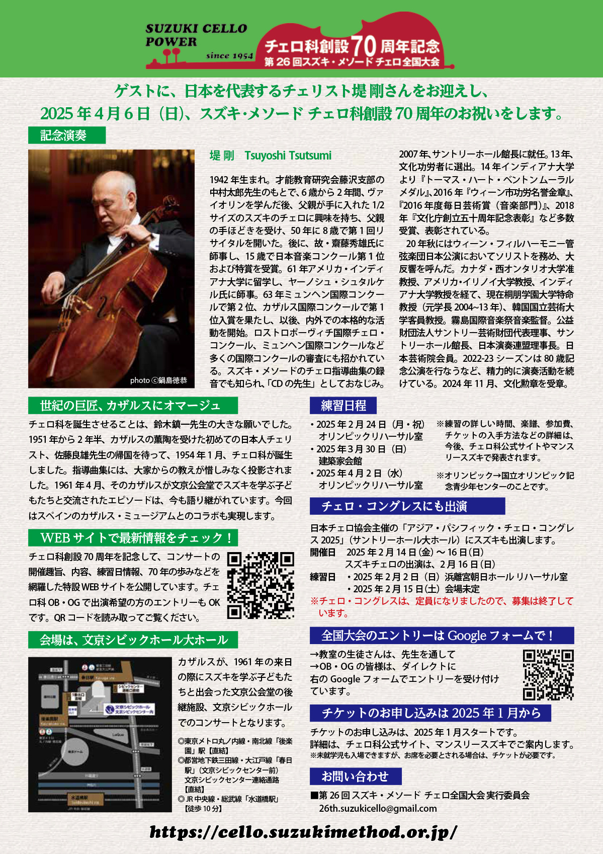このたび令和6年文化勲章を受章された堤剛先生による演奏曲が、バッハの無伴奏チェロ組曲第1番に決まり、また、ヴァイオリン科との合奏曲についても曲名が決まりましたので、チラシのリニューアルを行ないました。ダウンロードすることも可能です。また、一部、チェロ科斉奏曲に変更がありました。