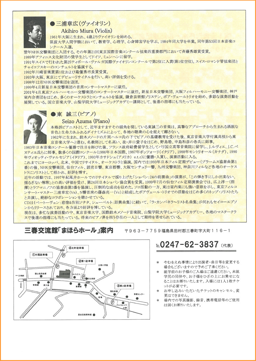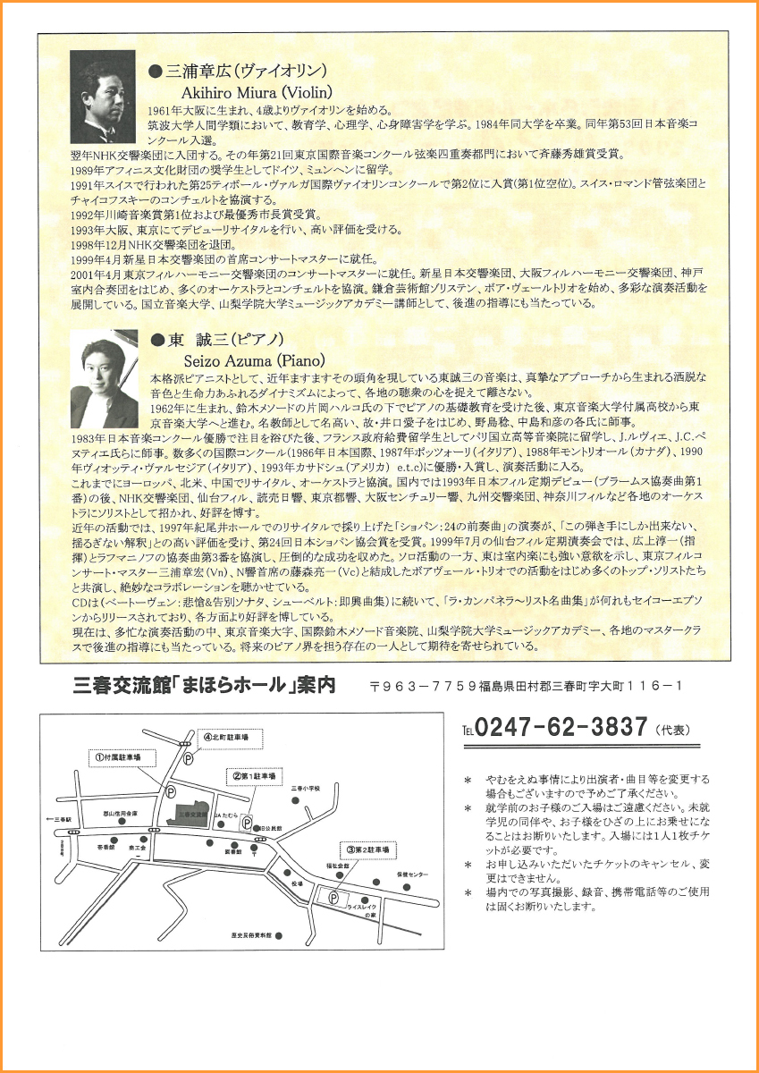 三春の「まほらホール」に来てくださるようになって、ほぼ毎年演奏を聴かせていただいています。ここ数年、特に楽器とホールが一体化してきたような感じがして、音量、音色ともにとても素敵になり、ファンの方も増えました。東先生との共演はいつも素敵なプログラムで楽しみにしています。