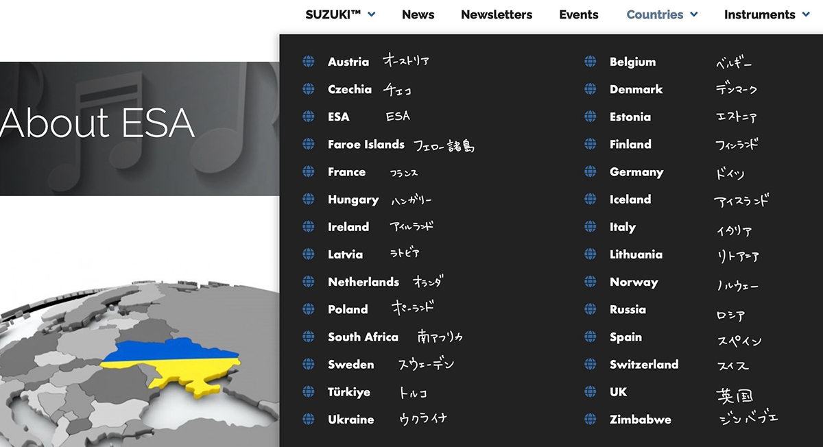 研究会の冒頭、お話があったのは、ヨーロッパ・スズキ協会(ESA)についての詳細な解説でした。現在ESAには28ヵ国(27ヵ国+ESA)が正式に加盟しており、スライドのような国々が参加しています。その国にスズキの先生はいるものの、スズキ協会を持たないチェコ、スロヴァキア、クロアチア、キプロスなどは、ESAに含まれます。重要なのは、「国にスズキの先生がいる」だけでは協会は成立せず、一定数の指導者がいて初めて正式な加盟国として認められる点。戦争や移住によって指導者数が減少し、かつては協会だった国が資格を失う例もあるといいます。