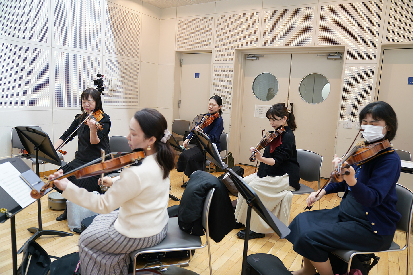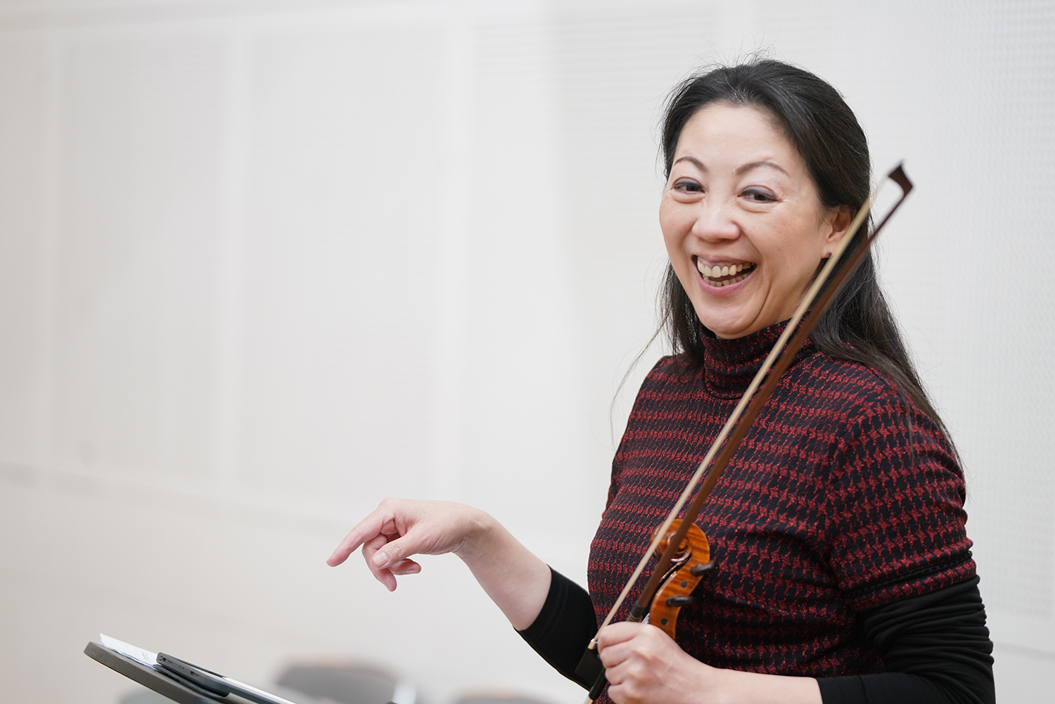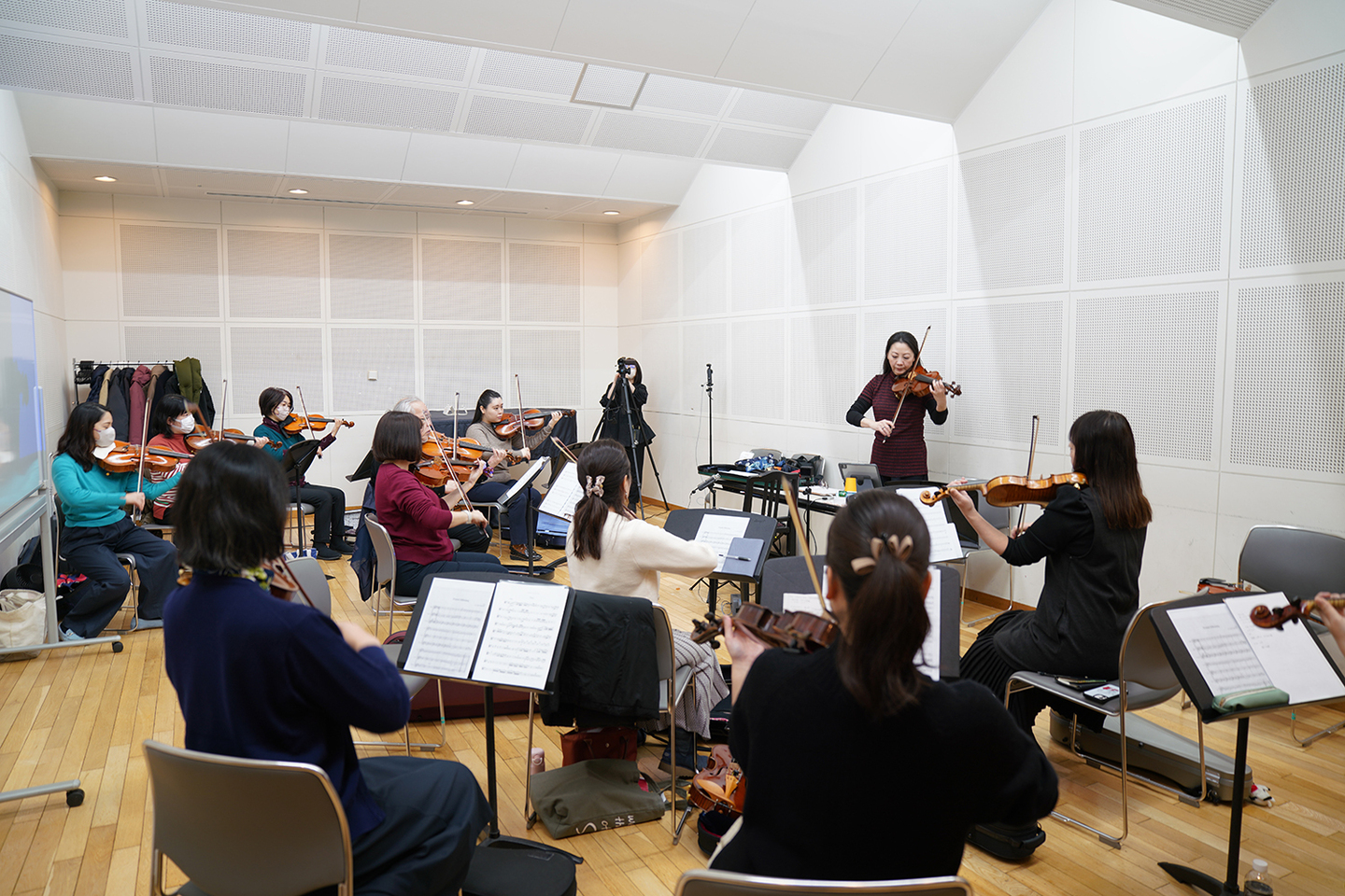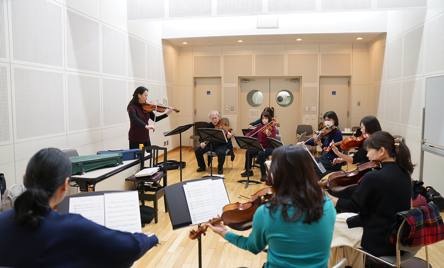 一般にヴァイオリンは音の立ち上がりが速く、無意識のうちに弓の動きも前へ前へと進みやすく、ヴィオラは、弦が太く胴も大きいため、同じ感覚で弾くと音が遅れ、重く感じられることがあります。合同レッスンでは、この違いが即座に「合わなさ」として現れます。その瞬間こそが、学びの入口となるというのです。