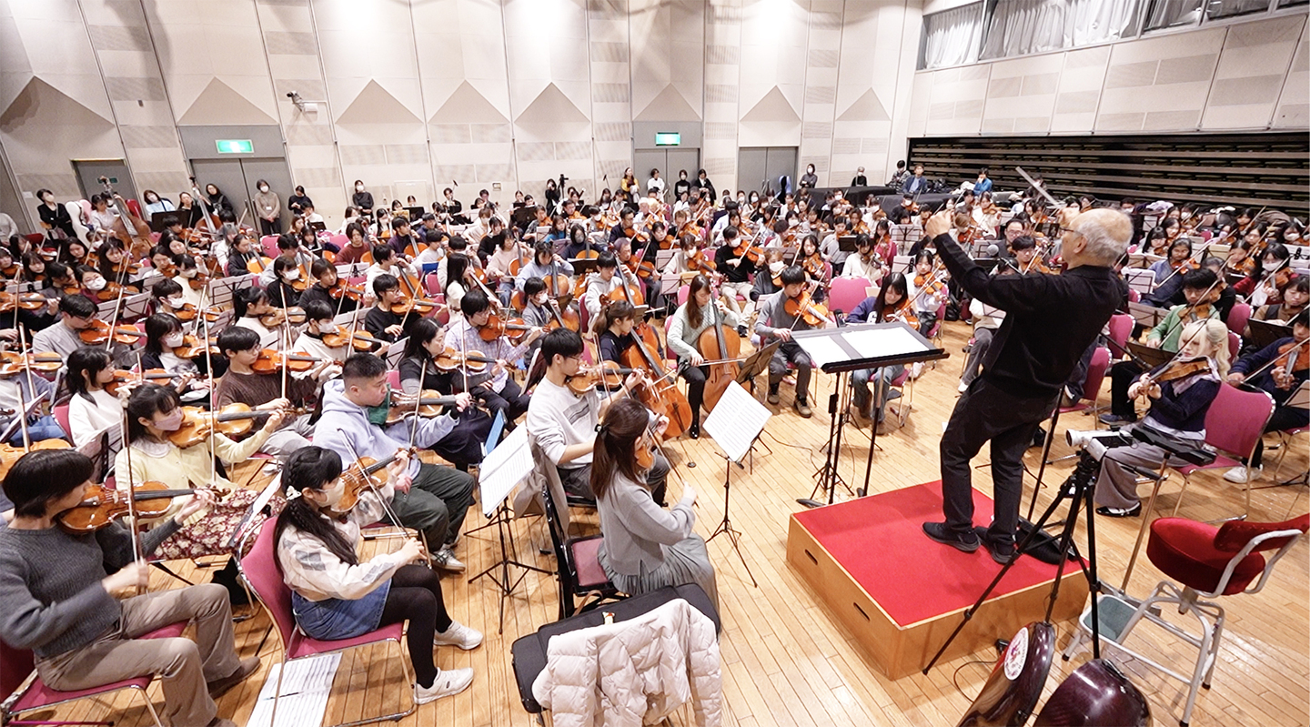 管楽器やコントラバスは当日PAが入るともう少し聴きやすくなるかとは思いますが、通常のオーケストラのようにお互い聴きあって合わせるということが難しいかもしれません。楽譜に齧り付くことなく、しっかり顔を上げて指揮者や前列の弓の動きを見るというように目を使うことが普段に増して必要になると思います。細かい音を合わせようとするよりもフレーズの向かう先を合わせるようにテンポ感を揃えていけたらと思っています。