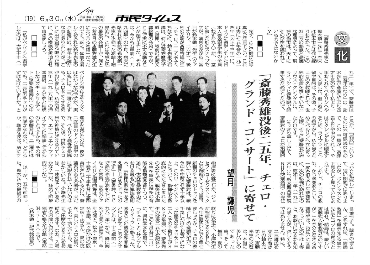 また、記念館初代館長の望月謙児さんが1999年に市民タイムスに寄稿された「齋藤秀雄没後25年、チェロ・グランド・コンサートに寄せて」の記事についても言及されていますが、実はその記事も記念館には保存されていて、改めてここで全文を紹介することにします。いかにも望月さんらしい切り口で、こと細かく、晩年の鈴木先生から直に聞かれた齋藤秀雄先生の留学時代の様子が記載されています。特に鈴木鎮一先生の実弟でチェロ奏者だった鈴木二三雄さんと齋藤秀雄先生の交流はとても新鮮な話題です。