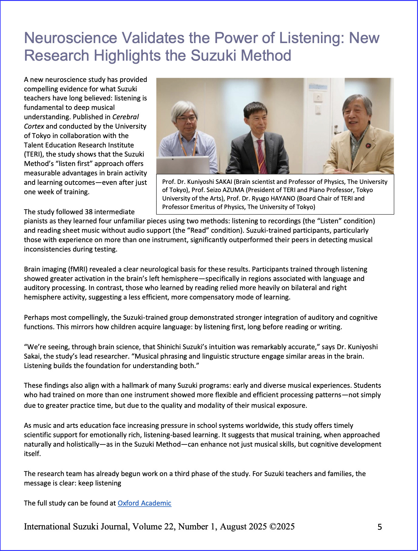 スズキの指導者が長年信じてきた、「聴くことが深い音楽的理解の基盤である」という経験則を、新たな神経科学研究が裏付けた。東京大学が才能教育研究会(TERI)と共同で実施し、Cerebral Cortex誌に掲載された本研究は、スズキ・メソードの「まず聴く」というアプローチが、わずか1週間のトレーニング後でも脳活動と学習成果に測定可能な優位性をもたらすことを示している。