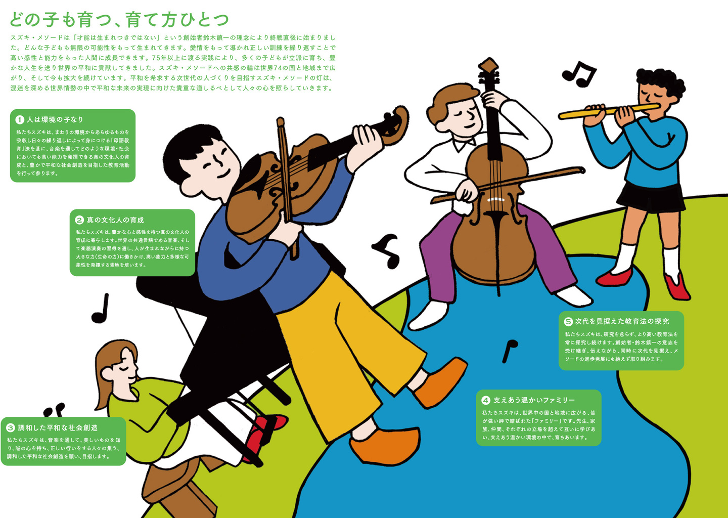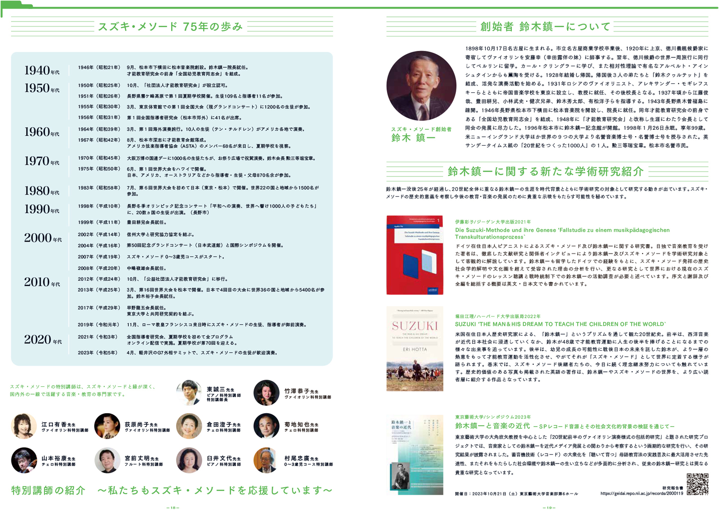 また巻末では創始者鈴木鎮一先生の軌跡や教育・音楽における貢献について、歴史的科学的な考証に基づく客観的な研究を行なおうとする新しい潮流についても紹介しています。