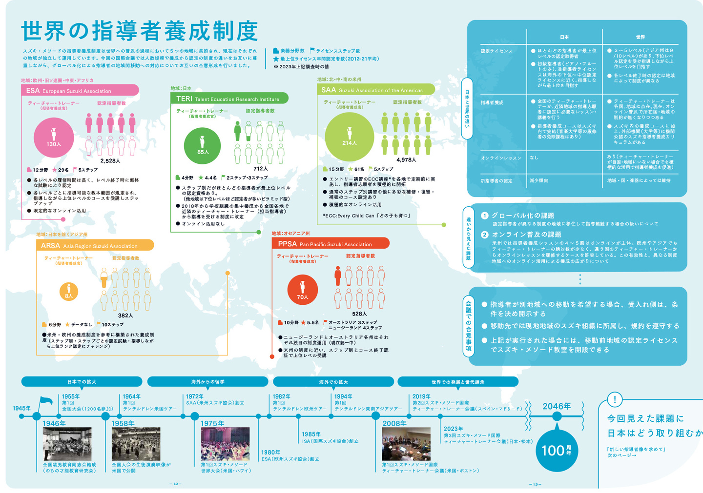 今回の報告書では通常のイベント・活動の年間報告に加えて、2023年10月に松本市で開催した「第3回スズキ・メソード国際ティ―チャー・トレーナー会議」を特集として詳しく報告しています。メインテーマであった指導者養成については、現在の世界共通の課題に加えて、今回の会議を通じて明らかになった発祥国日本と世界各地域の制度や組織の違いについて詳しくレポートしました。世界との違いを考察した上で、日本のスズキにおける新しい指導者像を紹介しています。