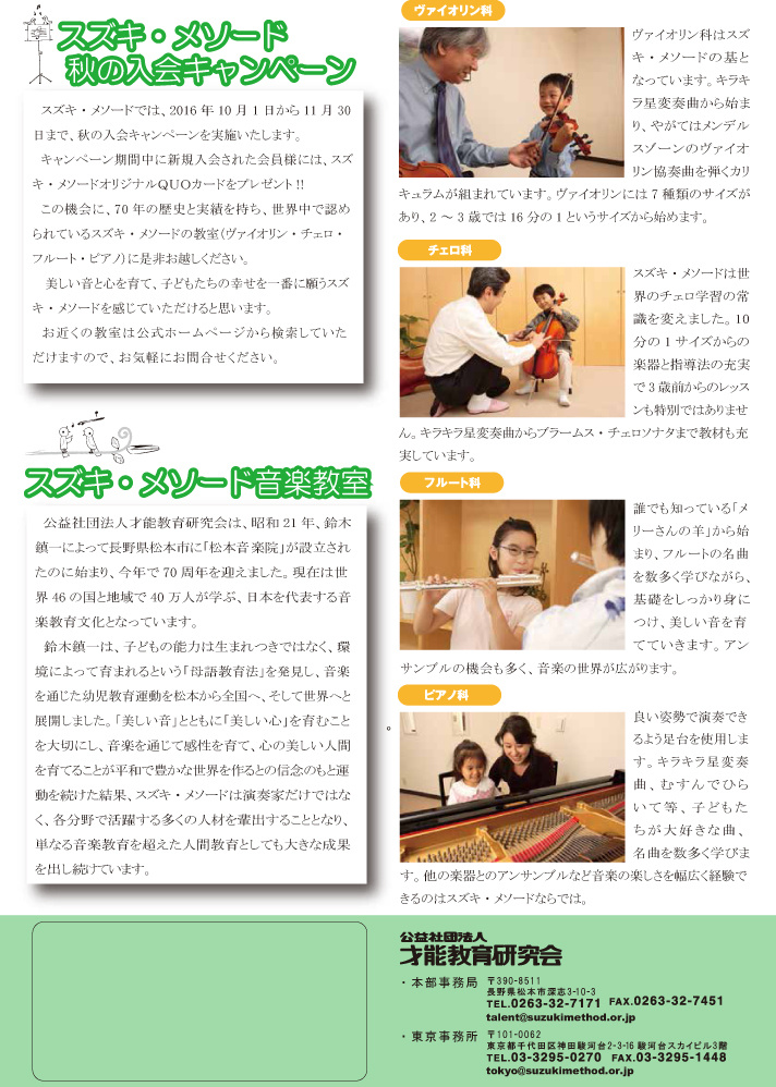 読書の秋、スポーツの秋、そして芸術の秋ですね。創立70周年を迎えたスズキ・メソードで、素敵な音楽体験は、いかがですか。