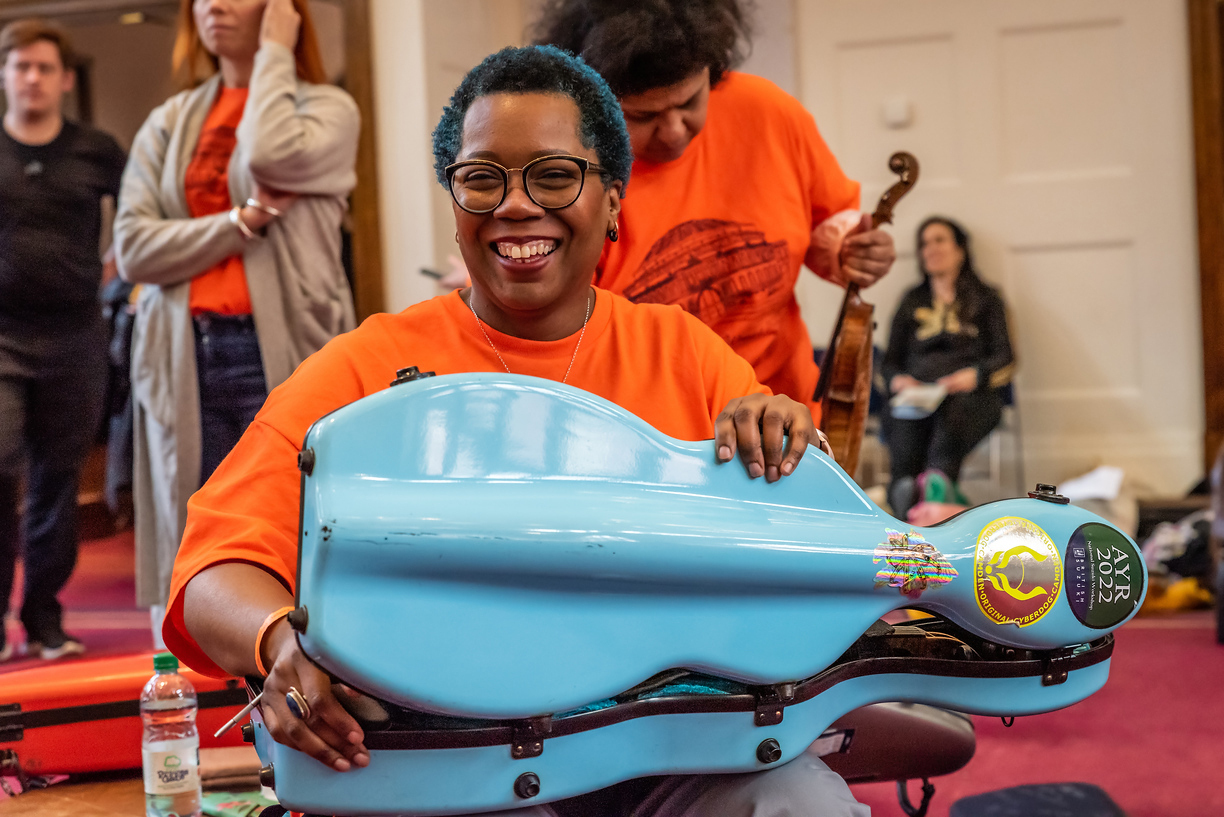 ブリテン・シアターでは、コンペアであるエドワード・クライトマン氏のスピーチを聞くことができます。エドワードと観客の写真を撮ってからメインホールに戻ると、なぜかステージとフロアの前に、さらに多くの演奏者が押し込められていました。一方、演奏のレベルは終日上昇し、オレンジ色の服を着た新しいリーダーによる熱心な指導も受けられます。私は後方の写真を撮るためにステージに上がりましたが、全員が写るようにしなければなりません。
