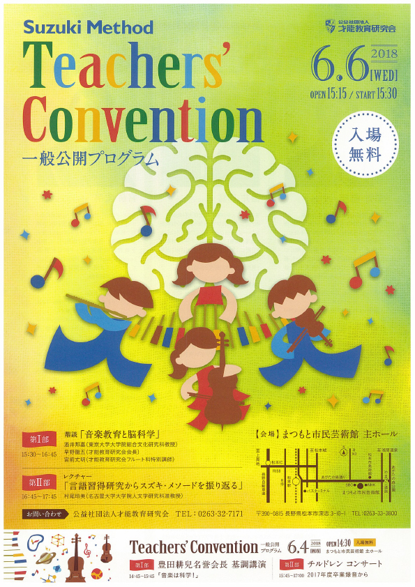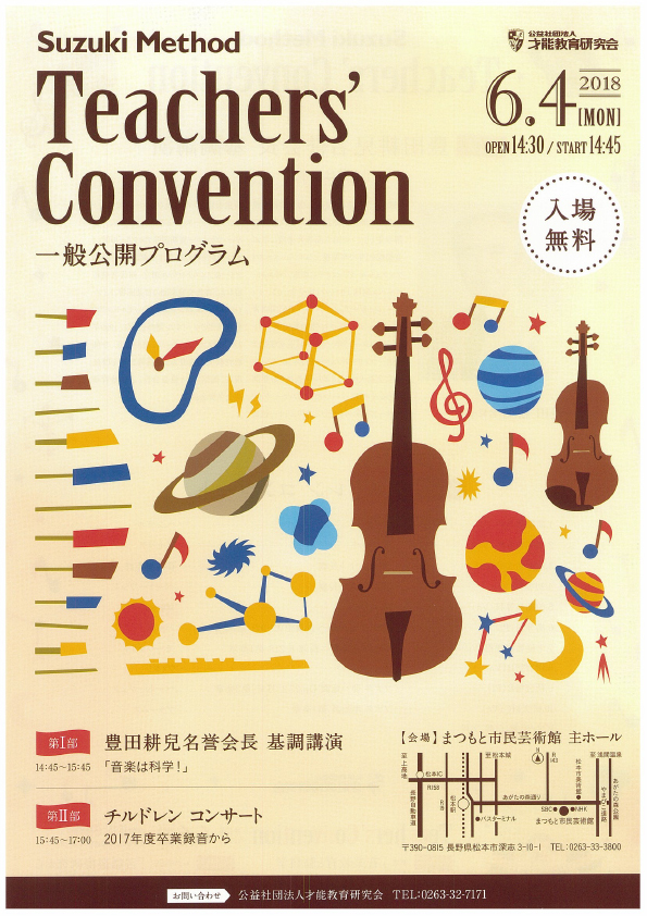 スズキ・メソードを教える指導者たちの真剣学び場、それが全国指導者研究会です。今年も、6月4日(月)〜7日(木)まで、松本市で開催されます。毎年、いろいろと新たな試みも加えられながら、ヴァイオリン・ピアノ・チェロ・フルート科の指導者たちが一堂に会し、精力的にレッスンや研究発表、分科会での意見交換、コンサートなどに励む研究会ですが、実は、公益社団法人として一般の皆様にもご参加いただけるプログラムをいくつも用意しています。それが、ここで紹介する一般公開プログラムです。