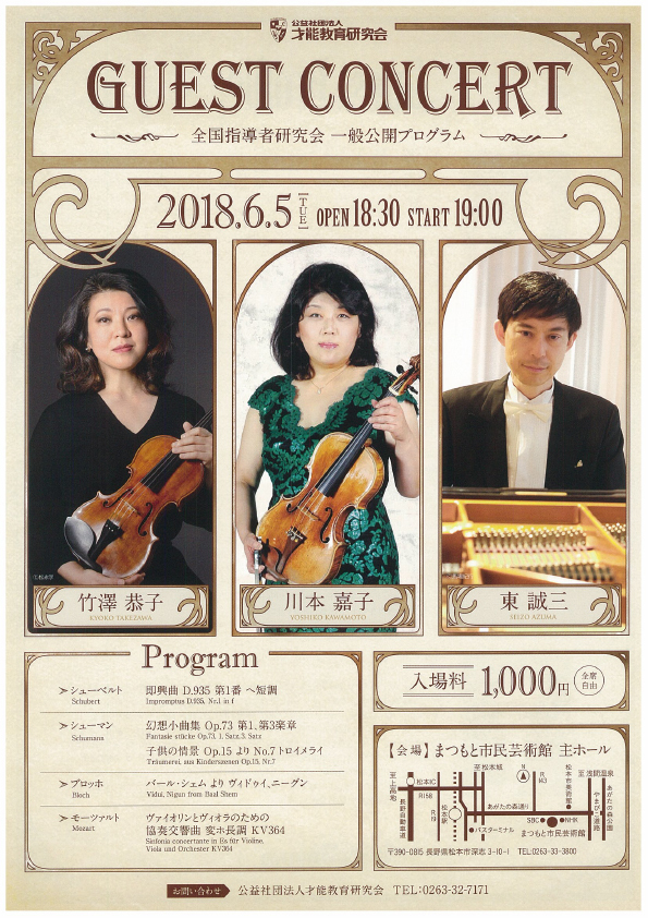 本会出身のヴァイオリニスト竹澤恭子さん、ヴィオリスト川本嘉子さん、ピアニスト東誠三さんによる豪華プログラムをお届けします。