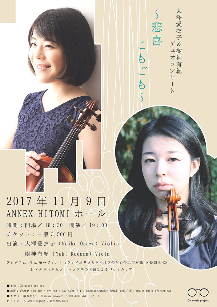 ヴィオラの樹神有紀さんとデュオとしては初めての共演です。これまで室内楽やオーケストラで何回かご一緒していますが、前々から彼女の人間性にとても惹かれていて、なんだか親戚のような不思議な感覚もおぼえる有紀さんとの共演、嬉しく思います。