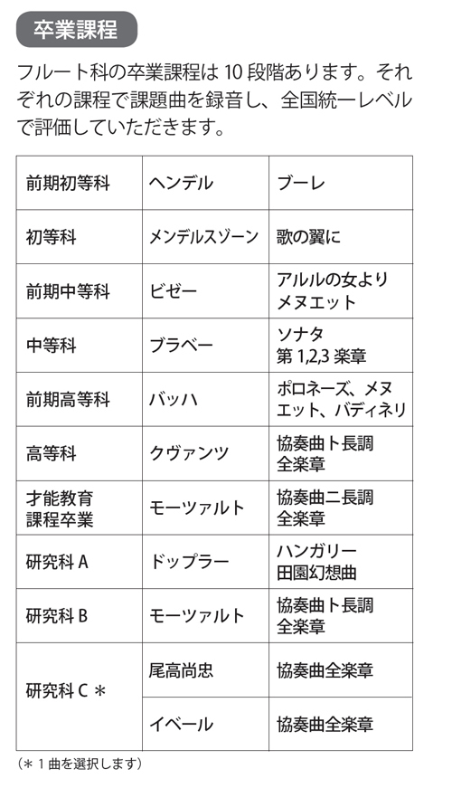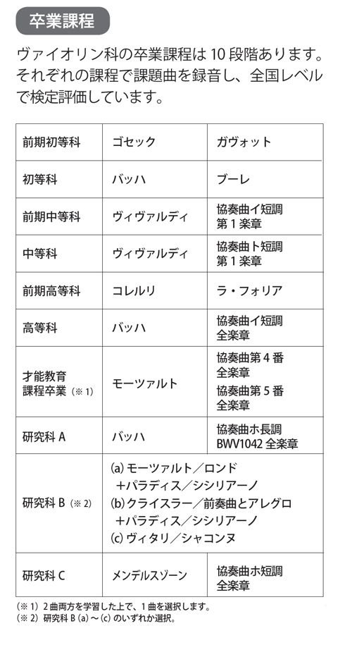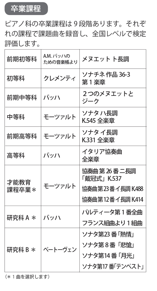 才能教育通信 第449号 スズキ・メソードの卒業制度は、ヴァイオリン、ピアノ、チェロ、フルートの各科ごとに、成長にあわせて課題曲を審査する独自のものです。卒業録音は、先生の判断で行なわれます。それぞれの先生と一緒に卒業録音を仕上げていく過程は簡単ではありませんが、録音を終えたときのホッとした気持ちは、一つやり遂げた自信になり、次への意欲作りの源になります。