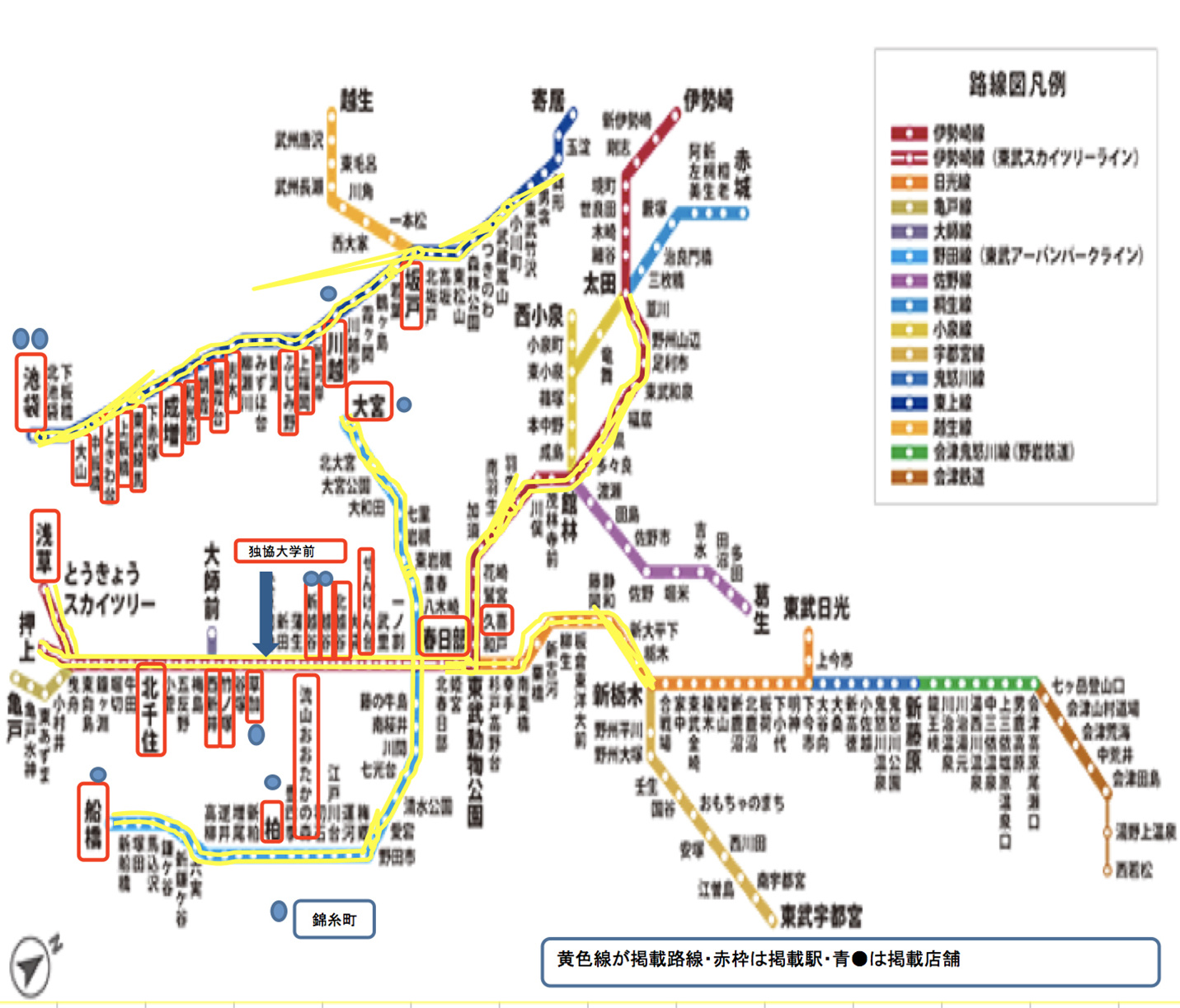 浅草、北千住、西新井、竹ノ塚、草加、獨協大学前、新越谷、越谷、北越谷、せんげん台、春日部、久喜、大宮、流山おおたかの森、柏、船橋、池袋、大山、ときわ台、上板橋、東武練馬、成増、和光市、朝霞、朝霞台、志木、ふじみ野、上福岡、川越、坂戸