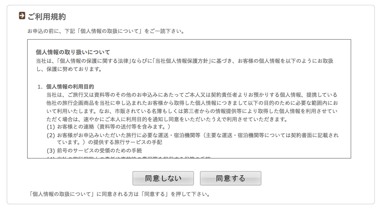 ❸ご利用規約の個人情報取り扱いについて読み、「同意する」ボタンをクリック。