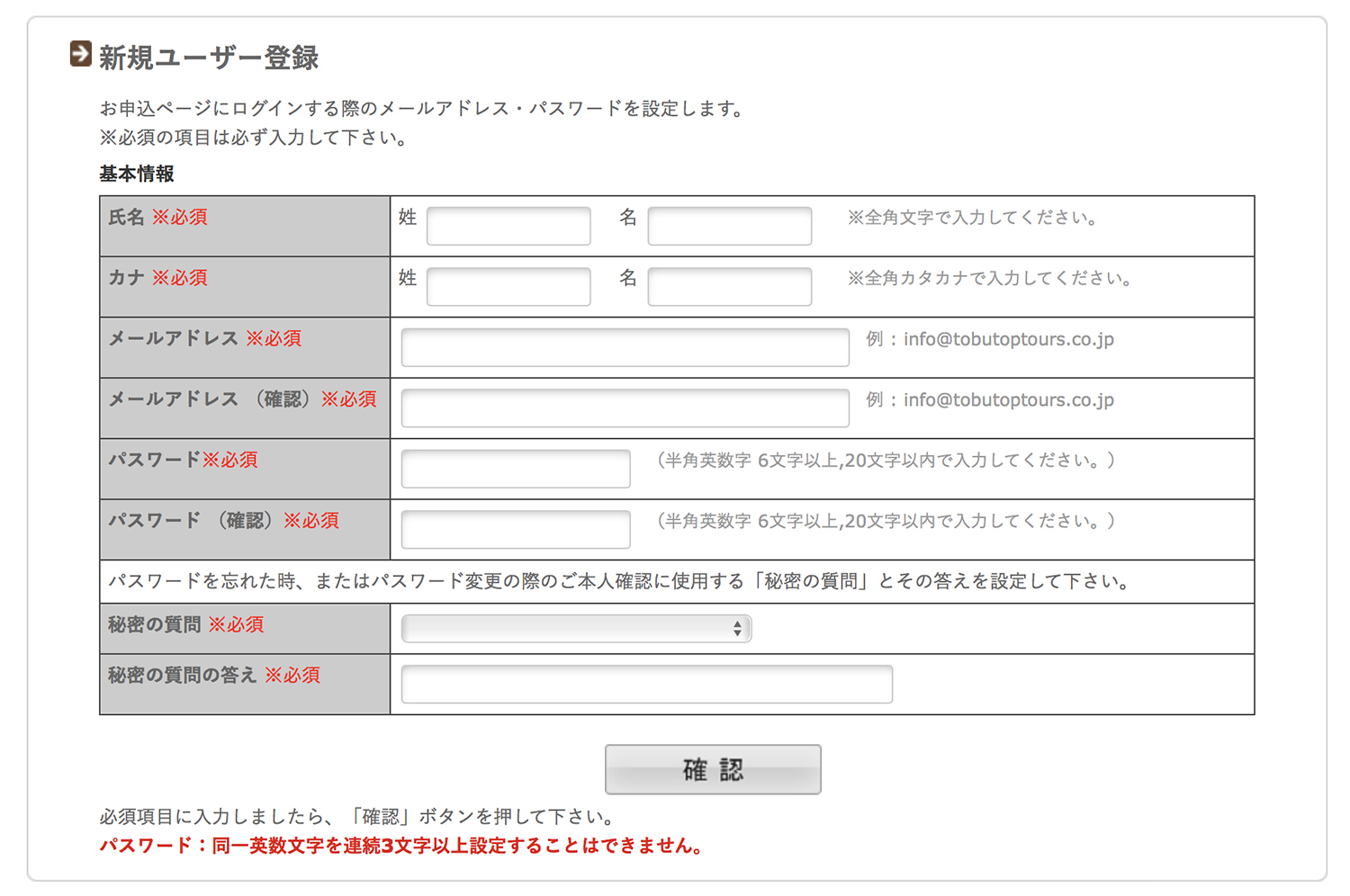 ❹新規ユーザ登録に必要事項を記入し、「確認ボタン」をクリック。
