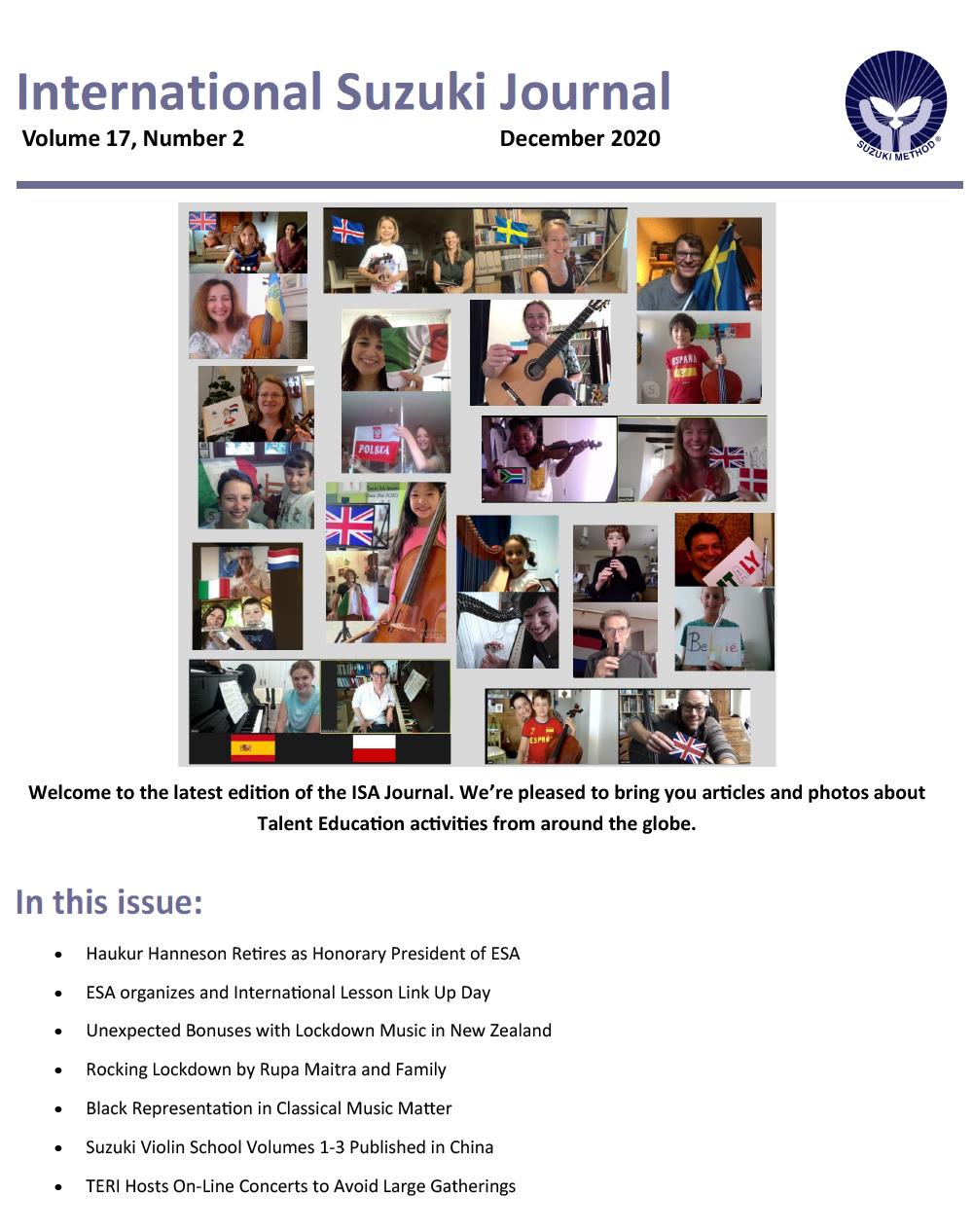 2020年12月に発行された最新号vol.17-2では、ESA(ヨーロッパスズキ協会)名誉会長ハウカー氏の退任、ニュージーランドでのロックダウンについて、黒人とクラシック音楽の表現について、中国でヴァイオリン科指導曲集発行のお知らせ、などとともに、才能教育研究会が2020年夏に開催した「おうち夏祭り」の様子も、YouTube画像へのリンクとともに紹介されています。