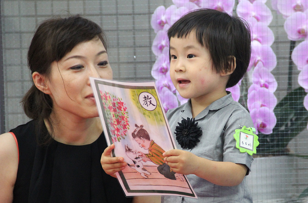 0〜3歳児コースで、松井恭代先生から表彰状を受け取りました。とても嬉しい瞬間でした とにかく毎日どこかでスズキでやったことを桃佳とやることにしていました。忙しい時はCDを流すだけのこともありました。俳句をやりたがらないことが多く、私もイライラしがちでした。桃佳がやらないと言い、「じゃあ、お母さんワンワン(桃佳のお気に入りのぬいぐるみ)とやろう!」と言ってぬいぐるみを目の前に置き、1人で進める。桃佳はまったく入ってこない。こんな感じが続いたこともあります。それでも、耳には入ってるし、見ています。突然スラスラと俳句を諳んじることができ、びっくりしました。