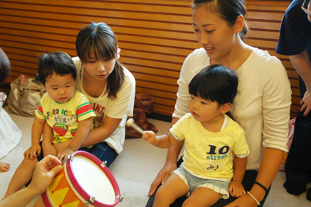 左が母親の佳子さん、美樹ちゃんの興味津々の様子が伝わってきます 0〜3歳児コースに参加するようになったのは、 美樹ちゃんが生後8ヵ月の頃でした。家で美樹ちゃんとできることを探していたら、お義母さんが紹介してくれました。ちなみに、お義母さんは、スズキ・メソードでピアノを教えている甘佐夏子です。
