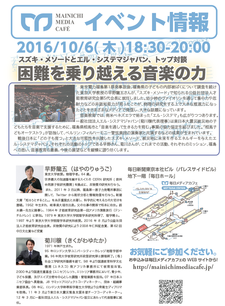 戦後日本に「どの子も育つ」と大きな可能性を示唆したスズキ・メソード、震災後の被災地に未来を作るエネルギーを与えたエル・システマジャパン、それぞれのトップ同士が、これまでの活動、それぞれのミッション、福島への思い、音楽教育の意義、今後の展望などを縦横に語り尽くします。