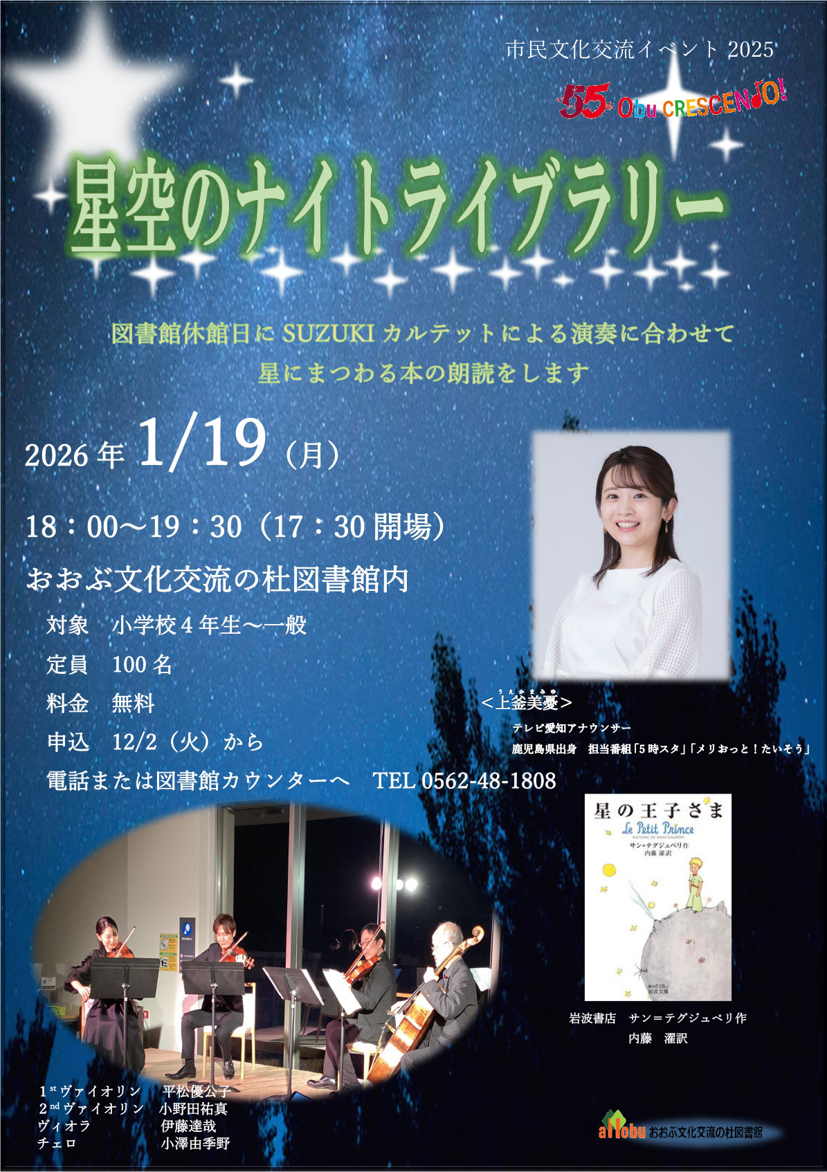 このたび、大府市のおおぶ文化交流の杜図書館で行なわれた朗読会「星空のナイトライブラリー」に出演させていただきました。