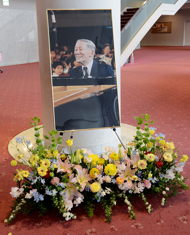 式典では、前期初等科から研究科Aまでの卒業生が4つのグループでステージに上がり、会場の皆さんから祝福していただきました。そして、各科代表生徒へ早野龍五会長より卒業証書が授与されました。最終課程研究科Bを卒業した生徒へは、早野会長とピアノ科教授、東誠三先生より記念品を一人ひとりに授与していただきました。