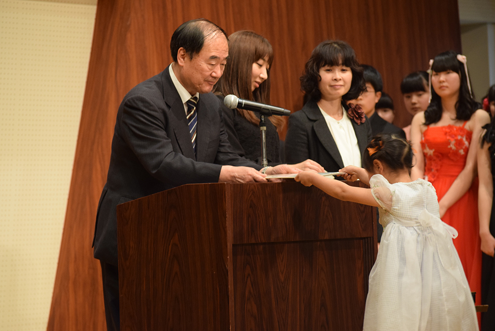 式典では、卒業式に出席した卒業生は全員、木村眞一業務執行理事より卒業証書を授与していただきました。そして理事から「私も幼い頃から母と一生懸命ヴァイオリンの練習をしていたお陰で、今でもヴァイオリンを楽しんでいます。皆さんもぜひ、大人になっても音楽を楽しんでください」というお祝いの言葉をいただきました。