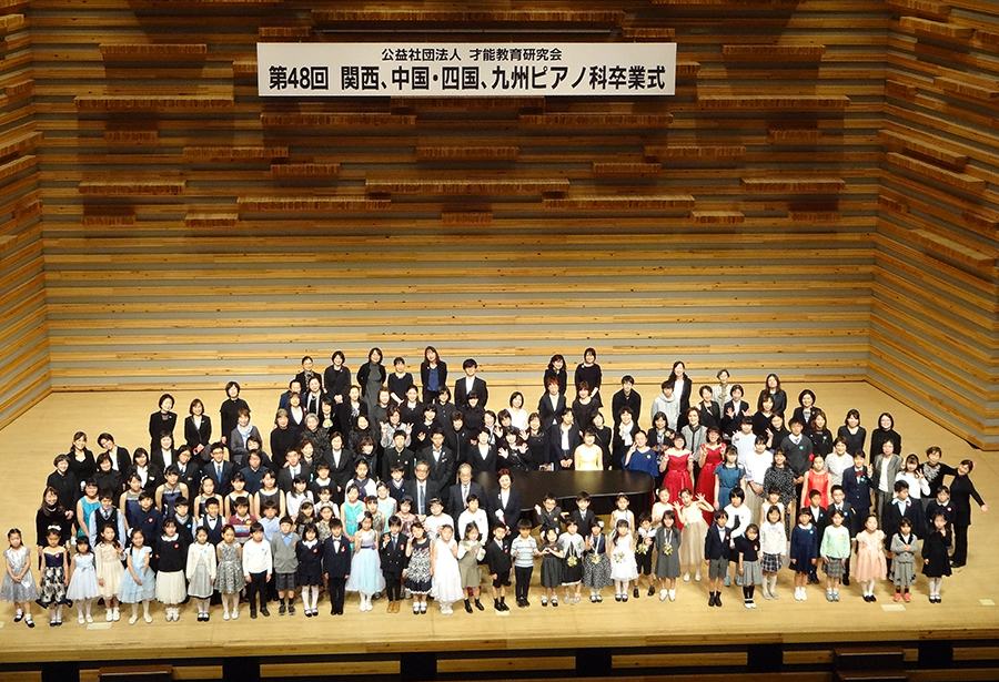 「第48回関西、中・四国、九州ピアノ科卒業式」は、3月29日(金)、大阪府豊中市立芸術文化センター大ホールにて行なわれました。午前中にリハーサルを終え、12:30開演。第1部は関西地区上級生を中心とした「スズキ・メソード関西地区オーケストラ」(指揮 江村孝哉)による、ヘンデル作曲「アラ・ホーンパイプ」の演奏で始まりました。華やかなファンファーレが響き、会場が盛り上がったところで、皆の憧れであるコンチェルトの演奏です。今年のコンチェルトは5年ぶりのピアノ協奏曲第26番ニ長調「戴冠式」K.537(モーツァルト作曲)です。3人の演奏者は3回のオーケストラとの練習を経て息もぴったりで、素晴らしい演奏でした。
