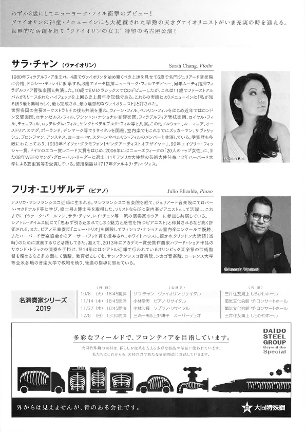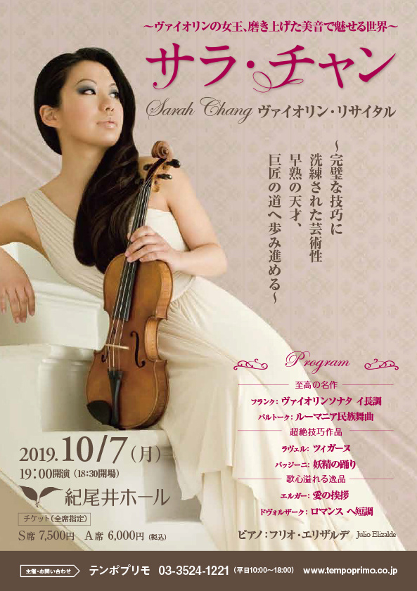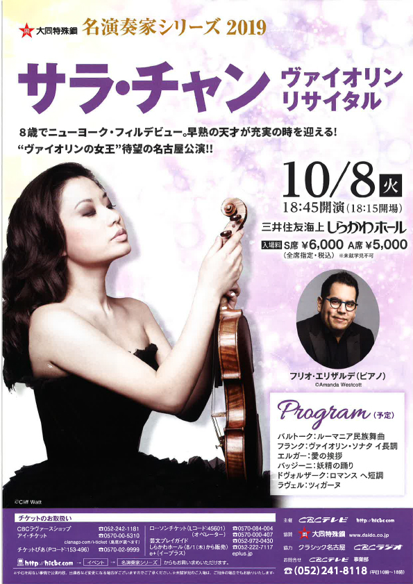 今年3年連続の来日では、東京と名古屋で再びリサイタルを開催。共演ピアニストのフリオ・エリザルデとは長年の実績を重ねて来たため、信頼関係は深い。自身による選曲で、バルトークの民族舞曲にフランクのソナタ、そしてラヴェルのツィガーヌなど、ヴァイオリンの王道を行く名曲がずらりと並ぶ。「すべてのレパートリーを完璧に磨き上げないと決して公で演奏しない」と語るサラ・チャンだけに、期待が大きい。卓越した技巧と洗練された芸術性を兼ね備えた彼女の演奏は、どのような進化を遂げるのか、是非会場でお聴きください。