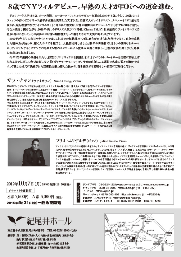 サラ・チャン(ヴァイオリン)、フリオ・エリザルデ(ピアノ)