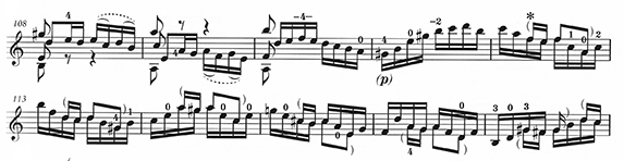 パルティータNo.1 CorrenteのDouble78と79小節。この指使いはエネスコのものです。79小節でサードポジションから、急にファーストポジションに飛ぶわけです。彼が求めている変化の必要性です。結構この移動にはエネルギーを使います。そして最後に明るい調子で終わるわけです。その部分を彼は二つに分けたわけで、弾いてみると、その意図がわかります。
