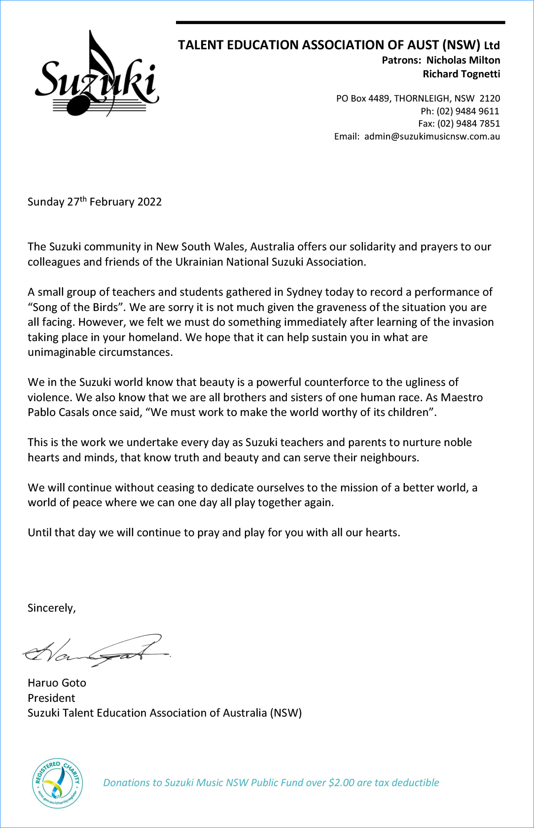 オーストラリア、ニューサウスウェールズ州のスズキコミュニティは、ウクライナ国立スズキ協会の同僚や友人たちに連帯と祈りを捧げます。