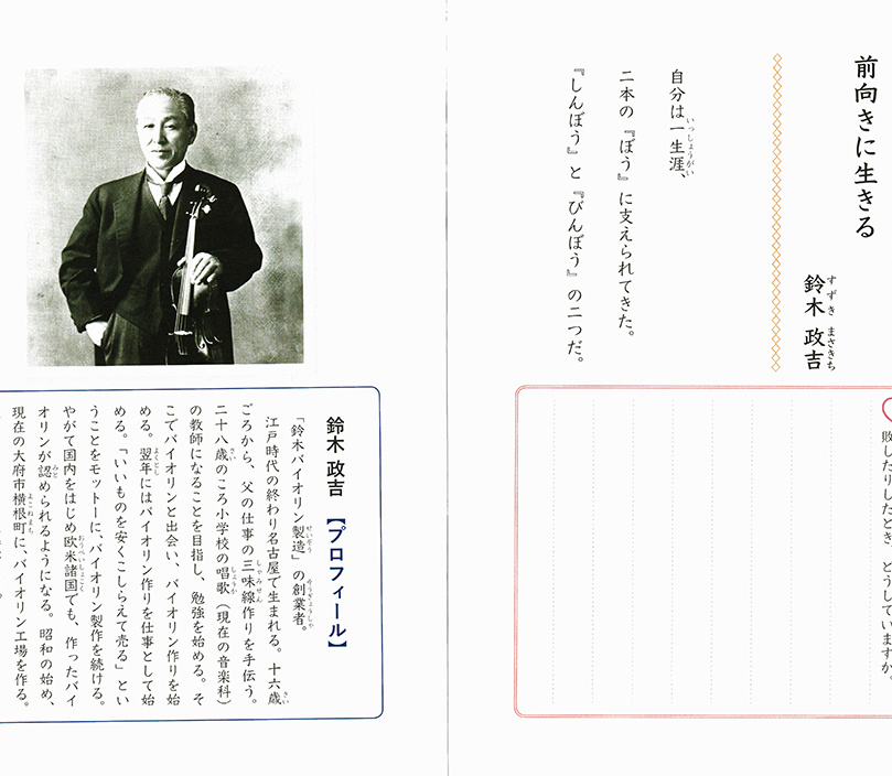 大府市道徳副教材に鈴木政吉さん、竹澤恭子さんが登場