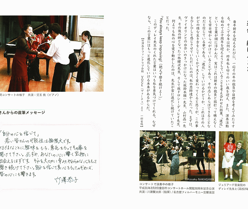 ところで、竹澤恭子さんは、平成18年度から3年に一度の割合で、大府市に4つある中学校のそれぞれの体育館で「学校訪問コンサート」を実施されています。つまり、大府市の中学生は、在学中に必ず竹澤さんの音を聴いていることになります。誠に羨ましい環境と言えるでしょう。