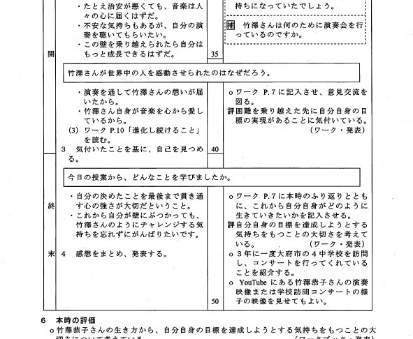 ここで紹介しました指導案例は、あくまでもサンプルです。その通りに授業が行なわれなくても構いません。道徳の授業は、授業者によって違う視点で捉えてもいい科目です。指導案は提案であり、展開は自由。正解はありません。今は、まとめない方向が道徳の授業スタイルです。投げかけ、討論し、考えを深めあう。友だちの考えを聞いて自分の考えを深めてゆくことが大切です。目標地点を設定して、そこに行かなければならないというのは、しません。「考えて討論する道徳」。ここが盛り上がるかどうかです。