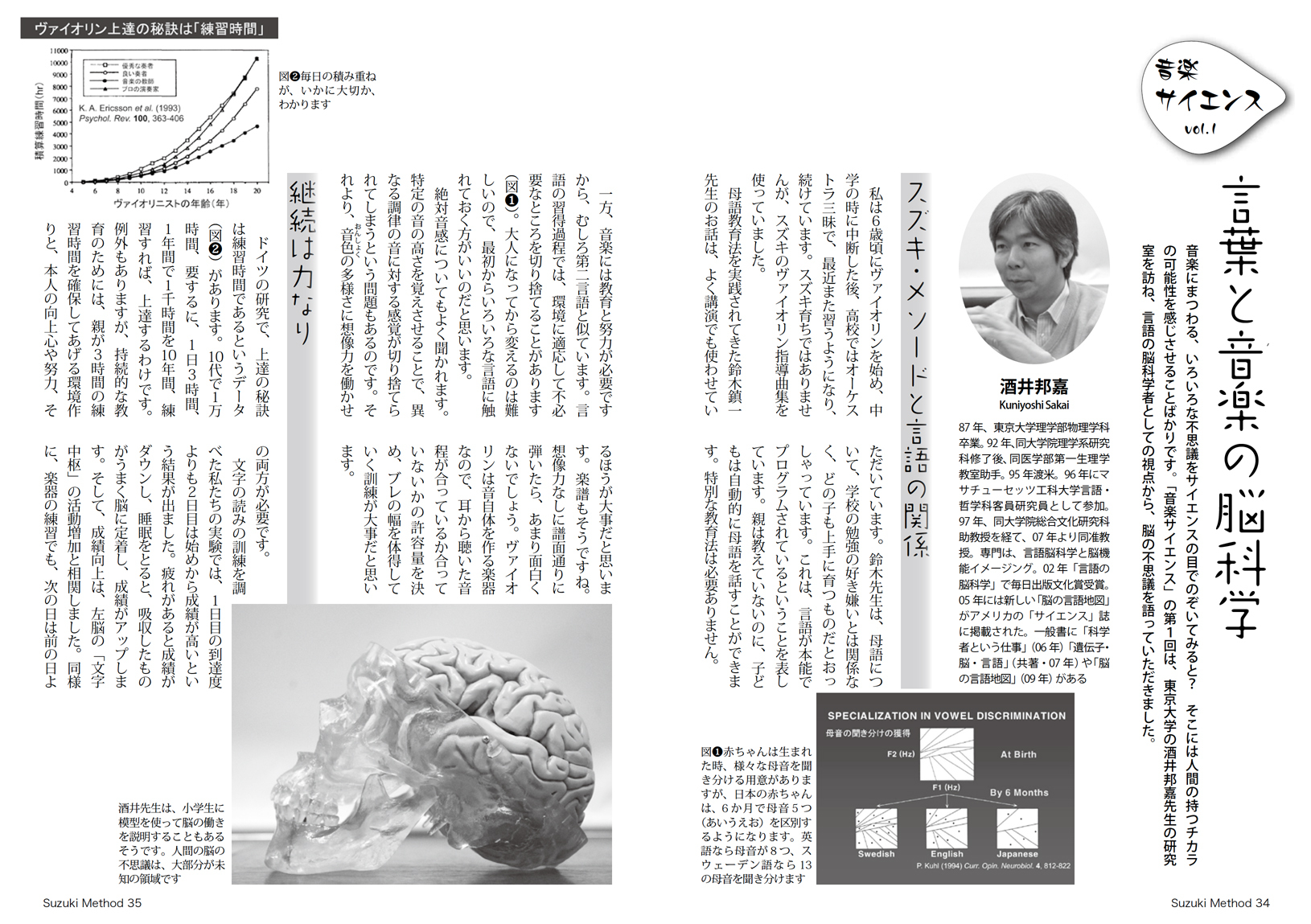 酒井先生は、子どもの頃からヴァイオリンを習い(スズキの指導曲集で、指導者は違ったそうです)、大人になってからはフルートも吹いていらしたことに加え、以前から鈴木先生の「母語教育法」、「音楽教育を超えた全人教育」にも興味を持っていらしたそうで、酒井先生の方からスズキ・メソードとの共同研究のお誘いをいただきました。