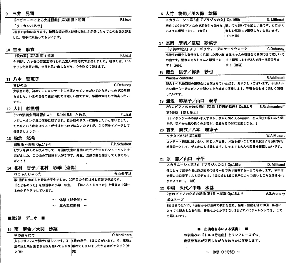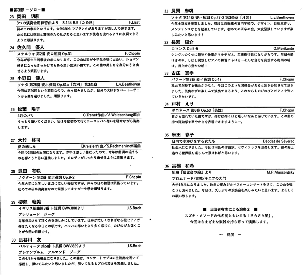 今回からは、参加者有志も運営に関わるようになり、次の10年を目指して、さまざまなアイデアが盛り込まれるようになりました。どの参加者も、忙しい時間を縫っての練習は、さぞかし大変だったはずですが、見事な演奏が続く姿は、一生音楽とともにある豊かな人生を目指すスズキ・メソードの理想形とも言えます。今後、ますますこの催しが広く知られるようになることを期待しています。