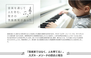 「奏でる家」を展開中のダイワハウスが、スズキ・メソードの数多くの魅力について、早野龍五会長へのインタビューで紹介するサイトを公開しています。スズキの歴史と理念、独自の教育法、そして家庭のあり方と家庭での環境づくりの大切さが伝わってきます。