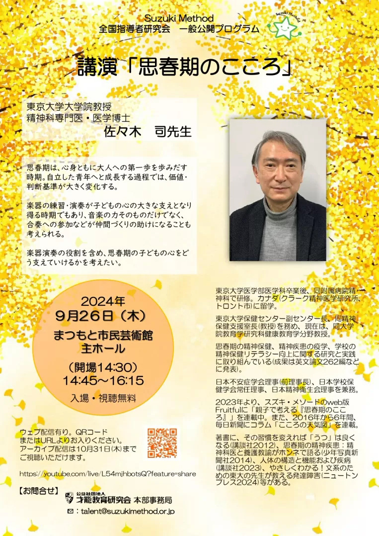 楽器演奏の役割を含め、思春期の子どものこころをどう支えていけるか、お話しいただきます。