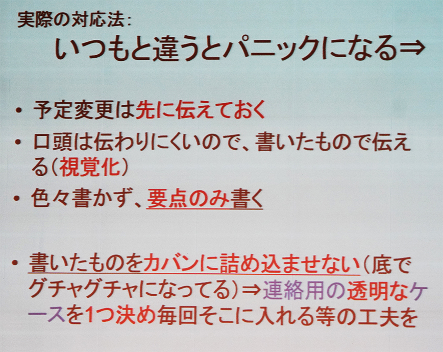 、これらはいずれも発達障害にみられやすい特徴でもあります。この問題を解決することは、なかなか難しいですが、そうした傾向があることをよく理解して対応されることをおすすめします」とお答えいただきました。その他にも、家庭では話ができるのに、社会不安のためにレッスン時に喋れなくなる場面緘黙(かんもく)の事例についてもお話がありました。